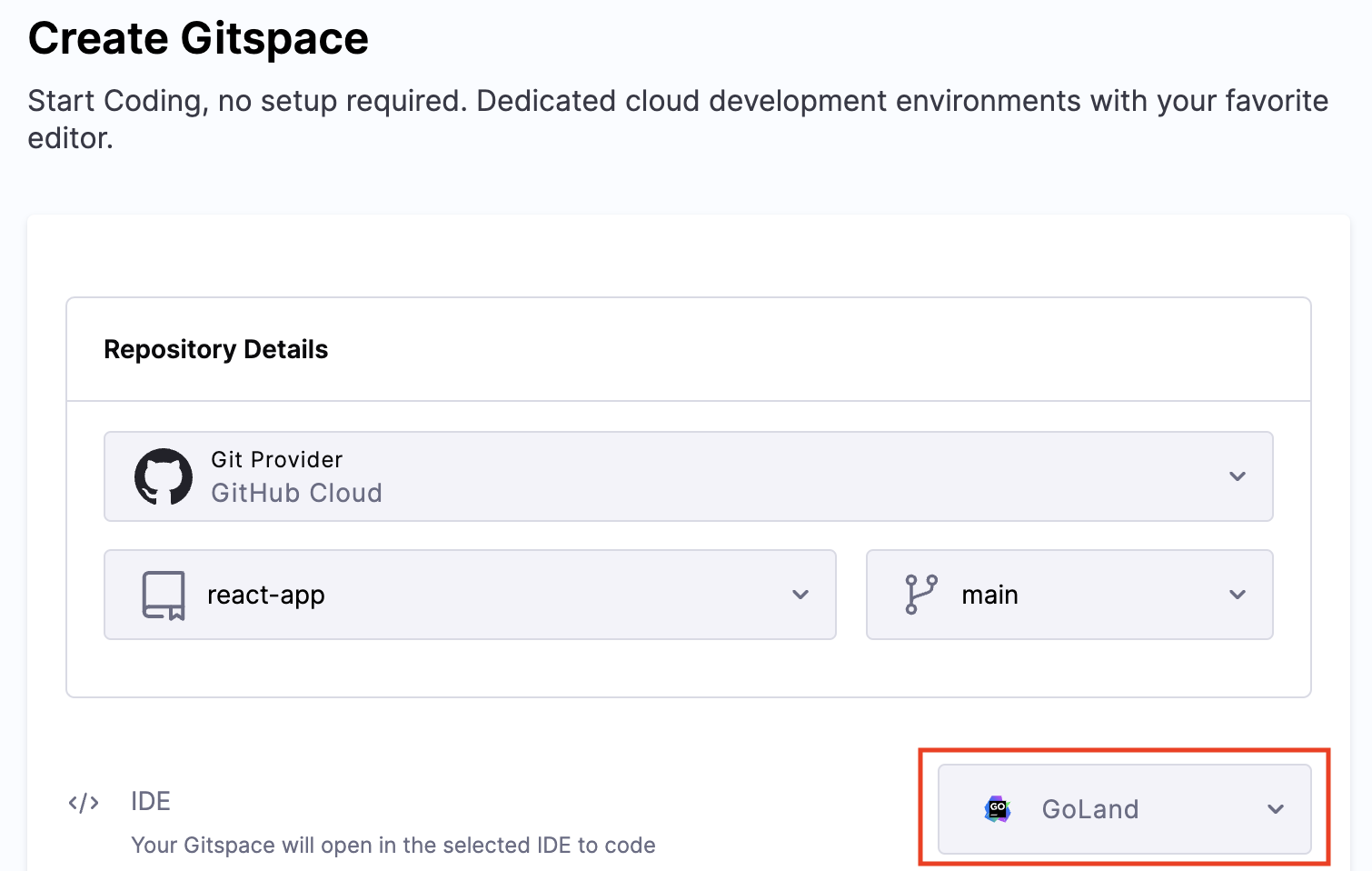 2. Select "GoLand" as the IDE during Gitspace creation.
