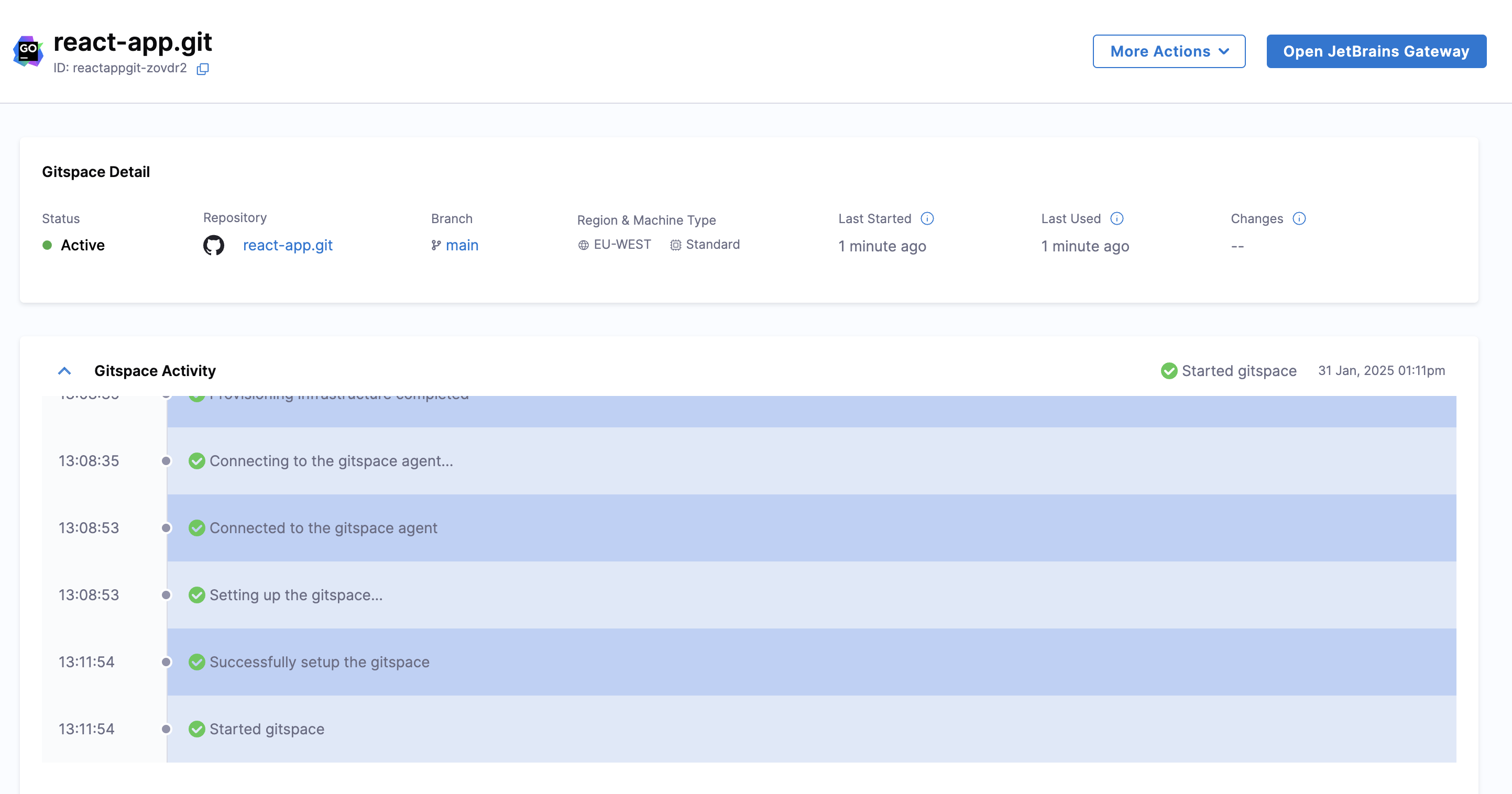 1. Once the Gitspace is created and running, click on the "Open JetBrains Gateway" button.