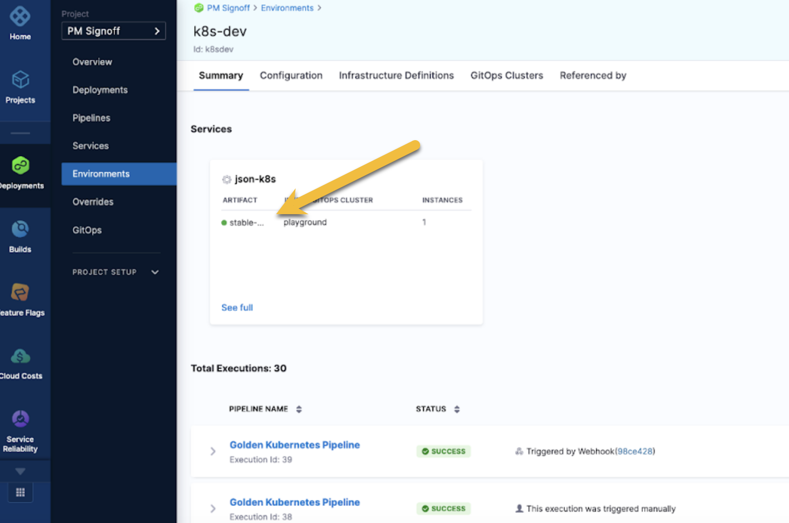 Go to Environments to see an environment. The summary dashboard will show what version of a service is deployed in your environment.