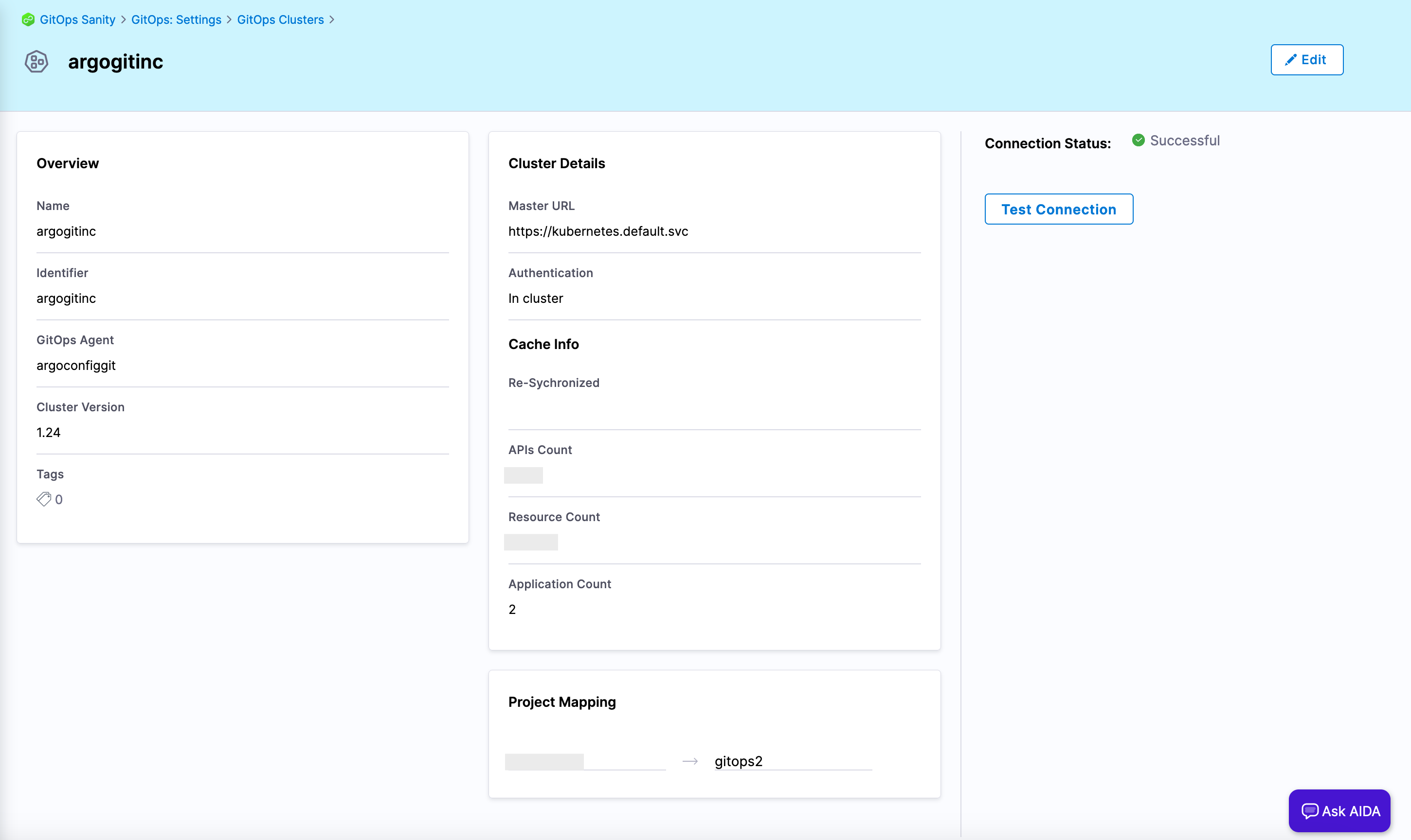 By default, Harness creates an AppProject for you when you create the repository and cluster at the beginning of this procedure. The name of this AppProject is available on the agent details page, under Mapped Harness Project. If you are creating a new AppProject, remember to add the mapping for the Argo project to the Harness project in the GitOps Agent, and then use the value of metadata.name in the project field of the entity configurations. The UI requires that information to show the entities.