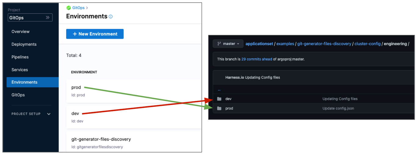 1. Harness Environments: Create environments (e.g., dev, prod) that match your Git repository folder structure. See Create GitOps Environments for detailed instructions.