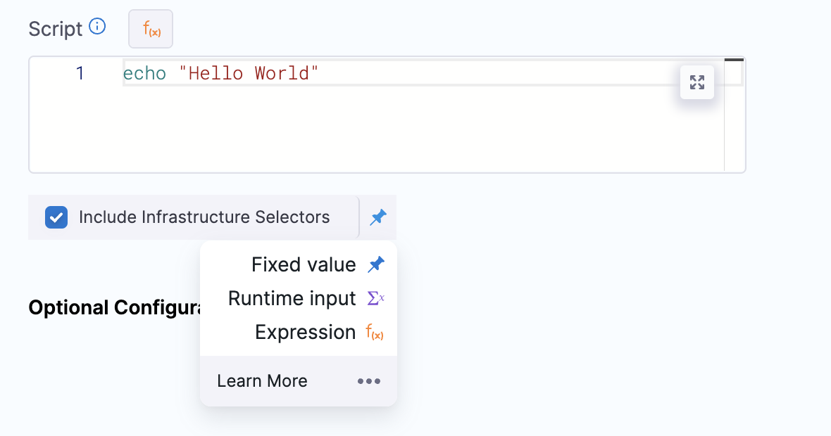 If your deployment type is Kubernetes and you want to use a Delegate installed on the target cluster, select Include Infrastructure Selectors. This option forces the shell script to run on a delegate that matches the selectors specified by the Kubernetes connector in the infrastructure definition.