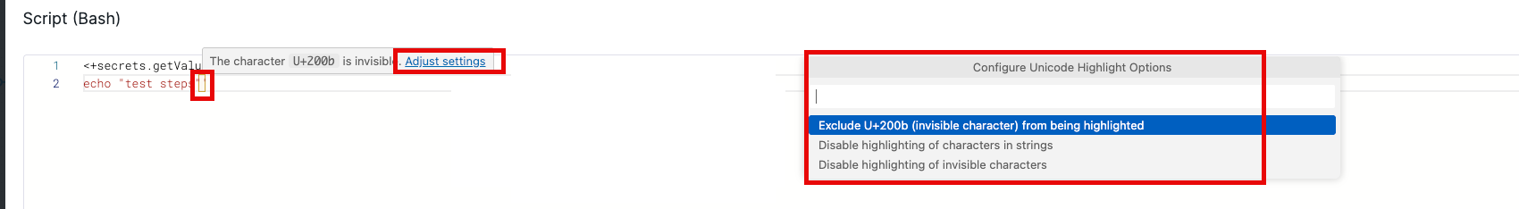 End users should see a highlighted space within their scripts, if an invisible character is contained: