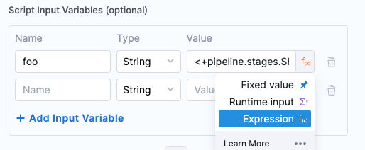 When executing a script, you can also dynamically capture the execution output from the script, providing runtime variables based on the script execution context, and export those to another step in the same stage or another stage in the same pipeline.