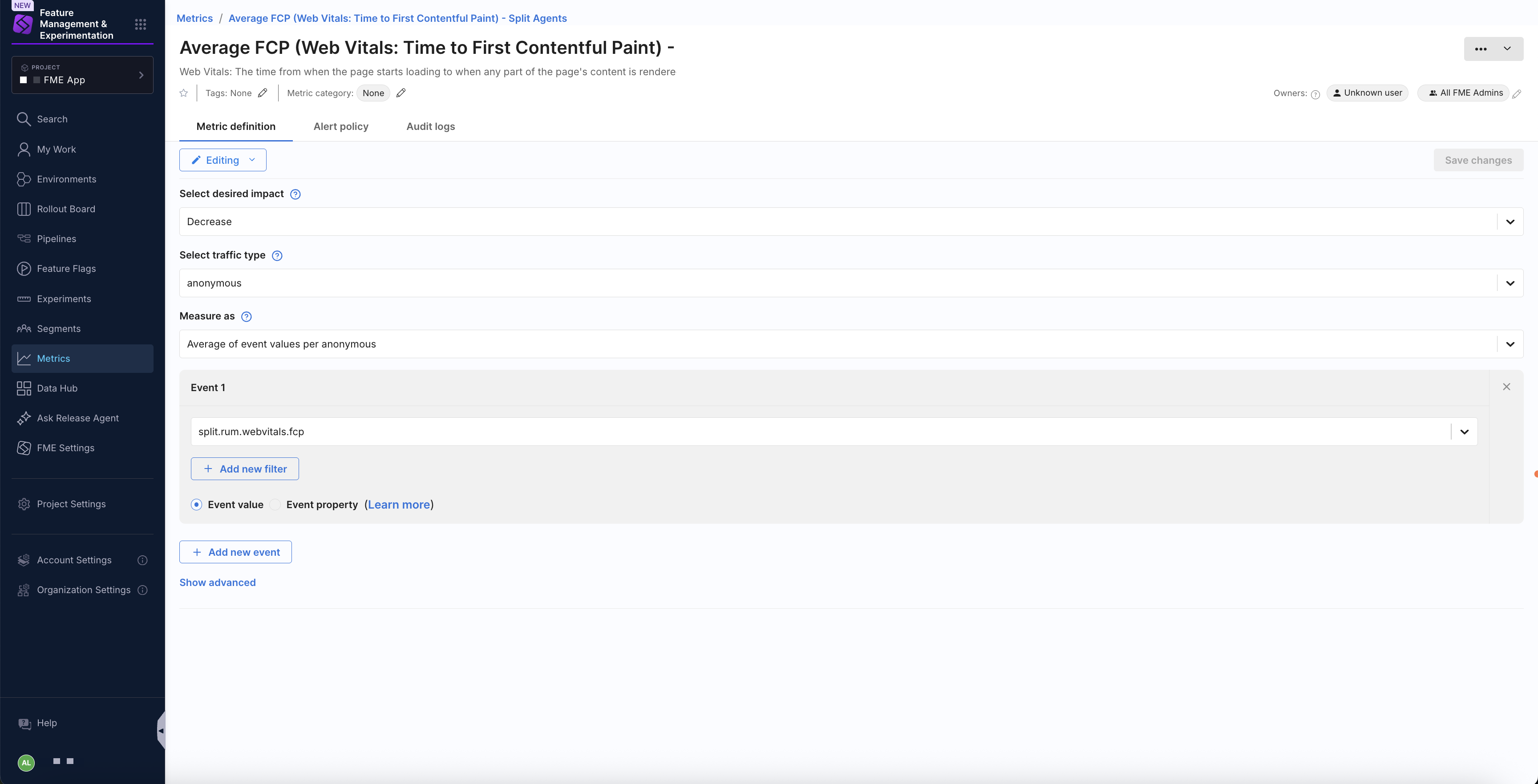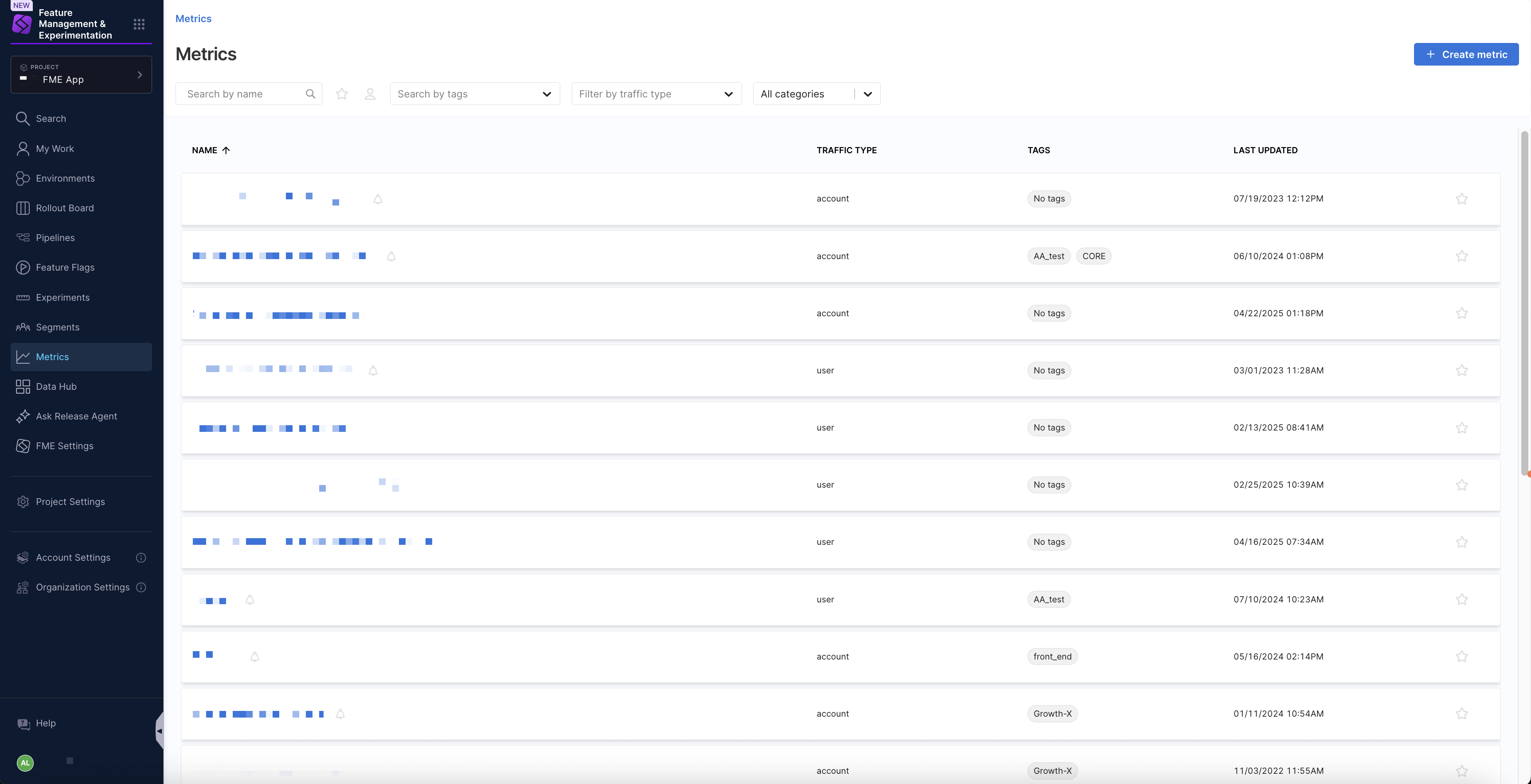 The Metrics page in Harness Feature Management & Experimentation (FME) provides a centralized list view for searching and managing your metricsA metric measures events that are sent to Harness FME and can count the occurrence of events, measure event values, or measure event properties. Metrics are used to evaluate the impact of feature flags and experiments on user behavior and system performance.. You can browse metrics created in Harness FME, scan key details such as traffic type, tags, ownership, and last updated time, and navigate directly to metric definitions, alert policies, and audit logs.