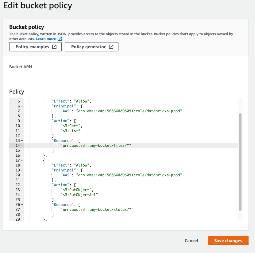 2. Under Edit bucket policy, select Bucket policy and replace the JSON with the following snippet. Update the Role ARN with the value generated by Harness FME as well as your bucket name as appropriate.
