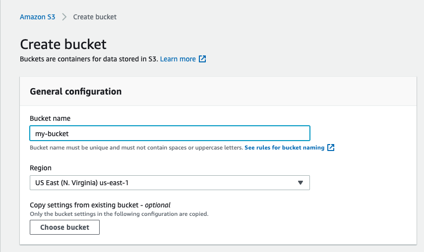 3. Create a unique bucket name. All other settings are optional.