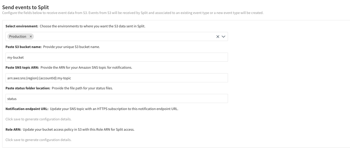 10. Navigate back to your Amazon S3 integration. Harness FME has generated the Notification endpoint URL and Role ARN fields.