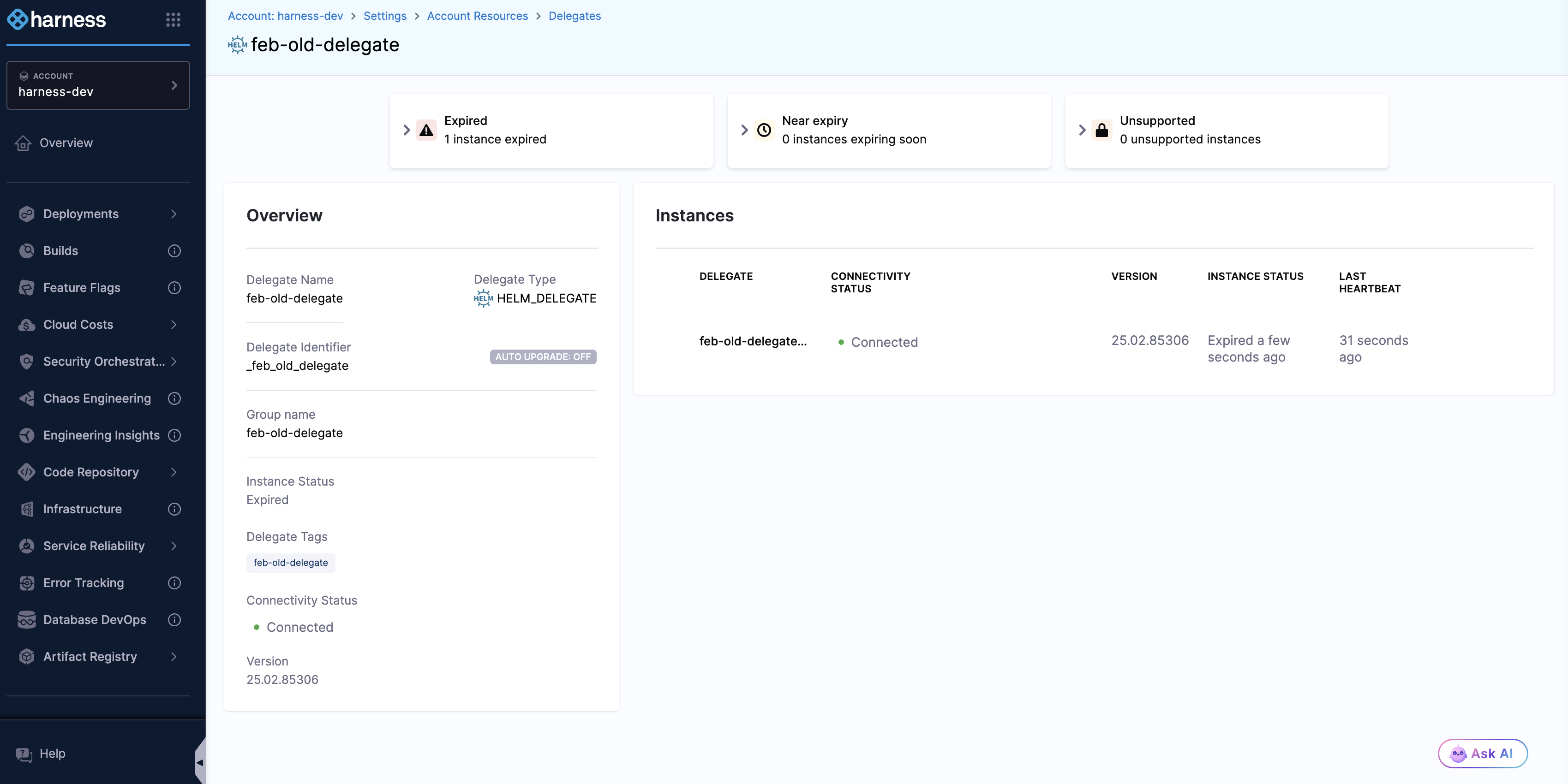 You can manage your delegate instances in your Harness account via the Delegate overview page. To access the Delegate overview page, navigate to your desired scope—Account, Organization, or Project—in your Harness account, and choose Settings > Delegates.