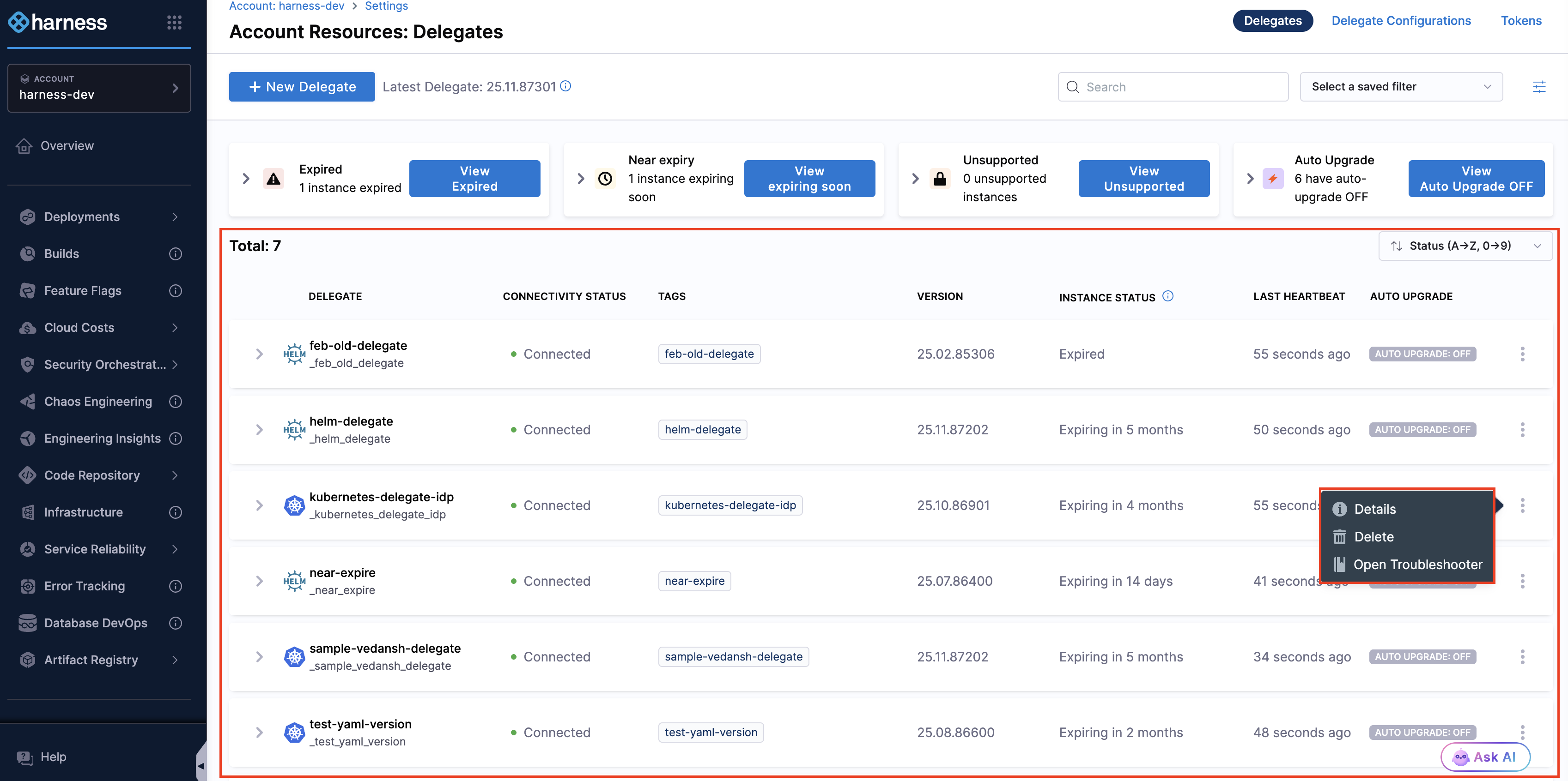 The vertical three dots on the right provide options based on the delegate type: Details leading to the group overview page, a Delete option to remove the delegate from the listing (Note: this does not uninstall the delegate from your infrastructure), and an Open Troubleshooter option appears for Delegate Type Kubernetes.