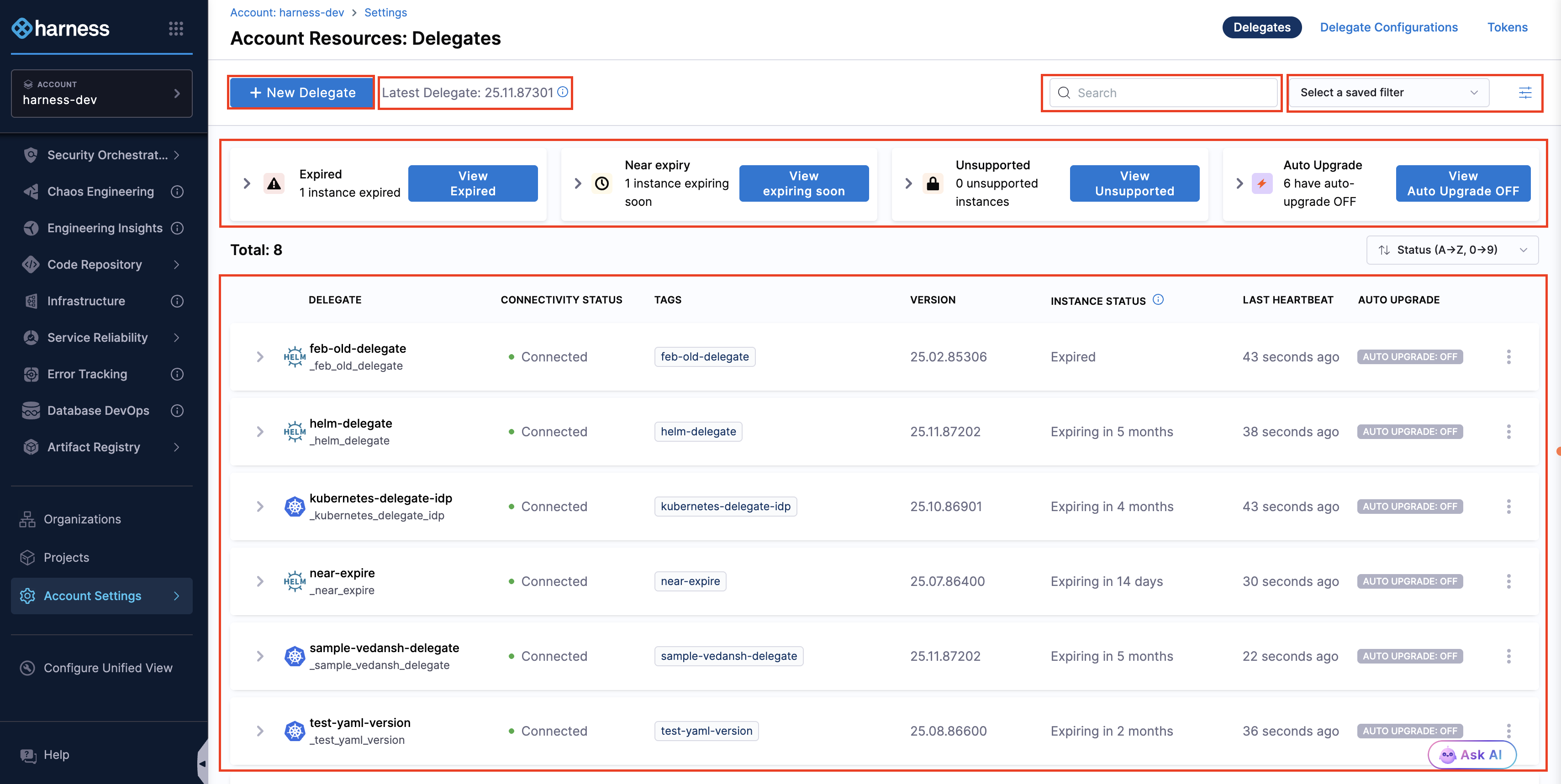 This page contains delegate-related information, including delegate installation, the latest version details, a search box, filters, delegate health overview cards, and a list of delegates with their details as shown in the image below