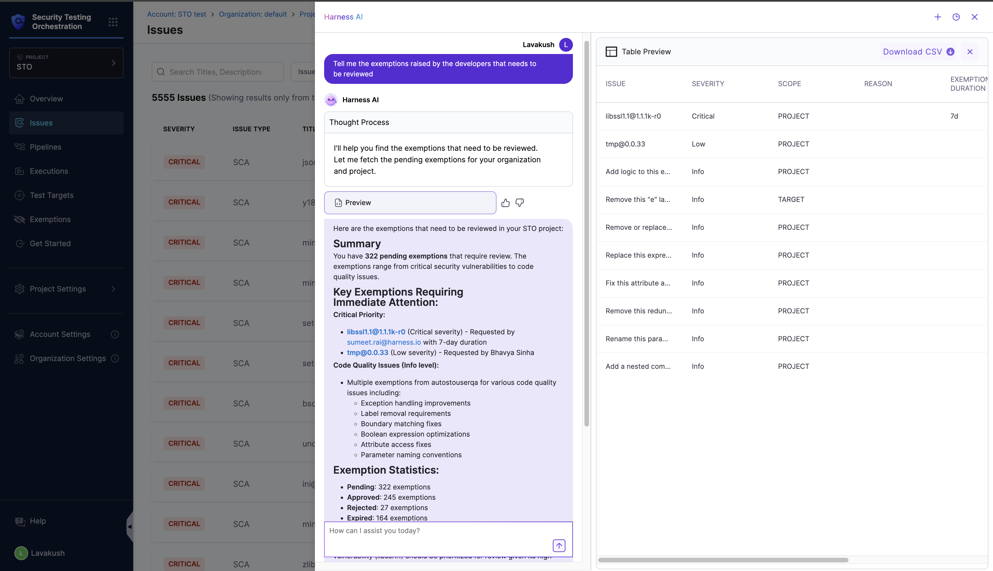 The AppSec Chatbot in Harness STO lets you explore STO data using natural language. Instead of navigating multiple dashboards or applying several filters, you can ask questions like "List all the issues of type secretin the project".