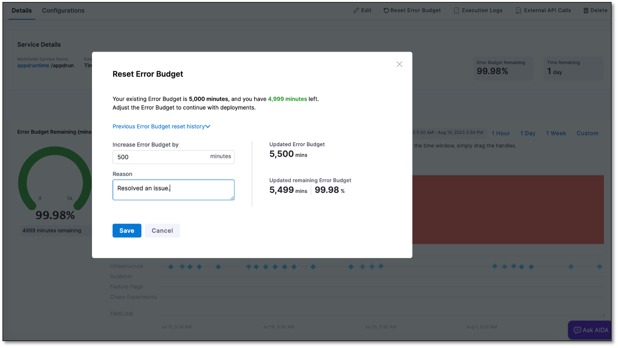 3. Specify the number of minutes by which you want to extend the error budget, and provide a reason for this adjustment. The updated error budget and the remaining budget are displayed.