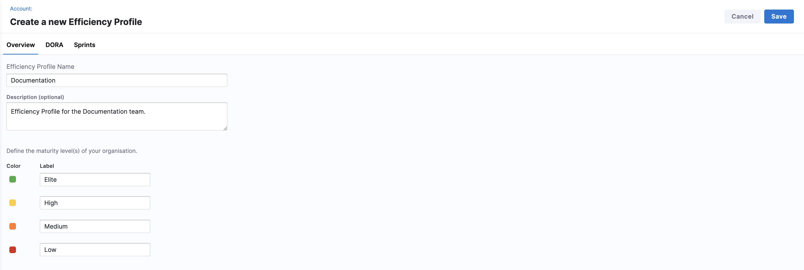 In the Overview tab, enter a name, add an optional description for the profile, and define your organization's maturity levels.
