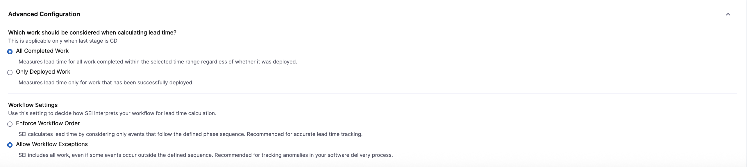 You can customize how SEI 2.0 interprets workflow events when calculating Lead Time for Changes.