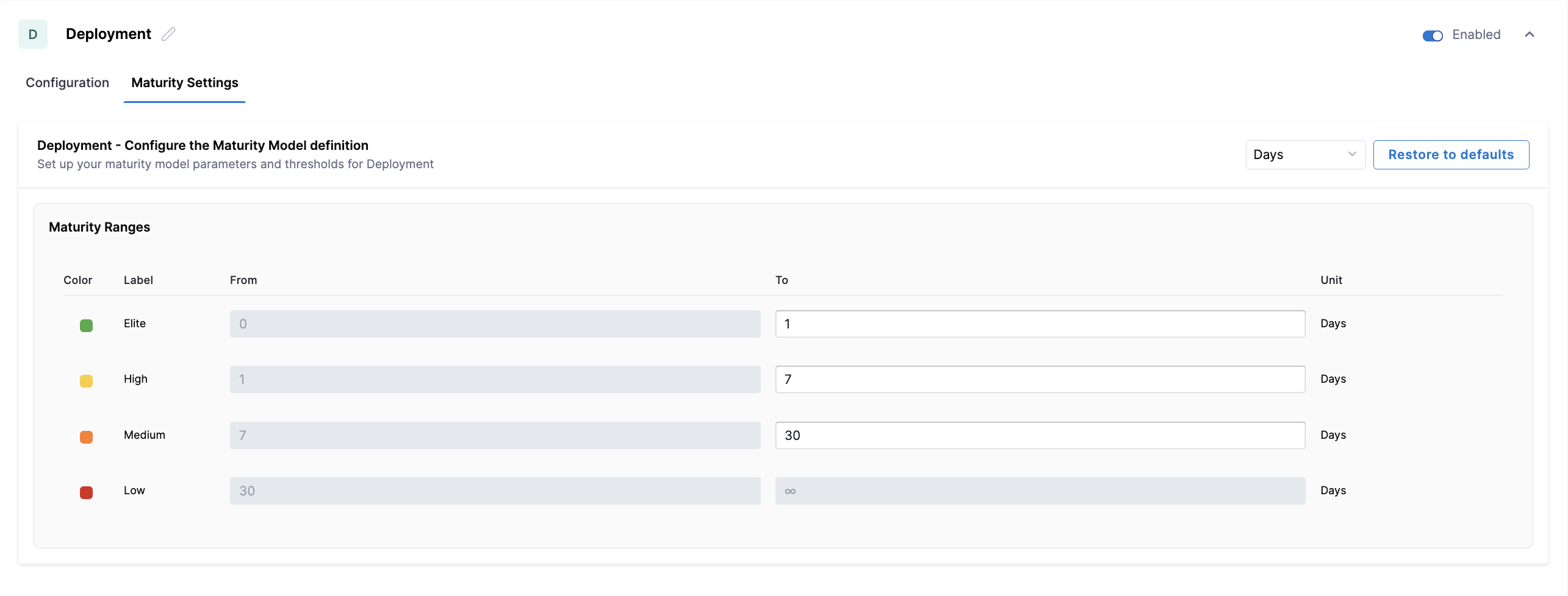 You can classify your teams' deployment performance into four color-coded bands in the Maturity Ranges section. Customize thresholds for Elite, High, and Medium performance; the Low band is automatically inferred.