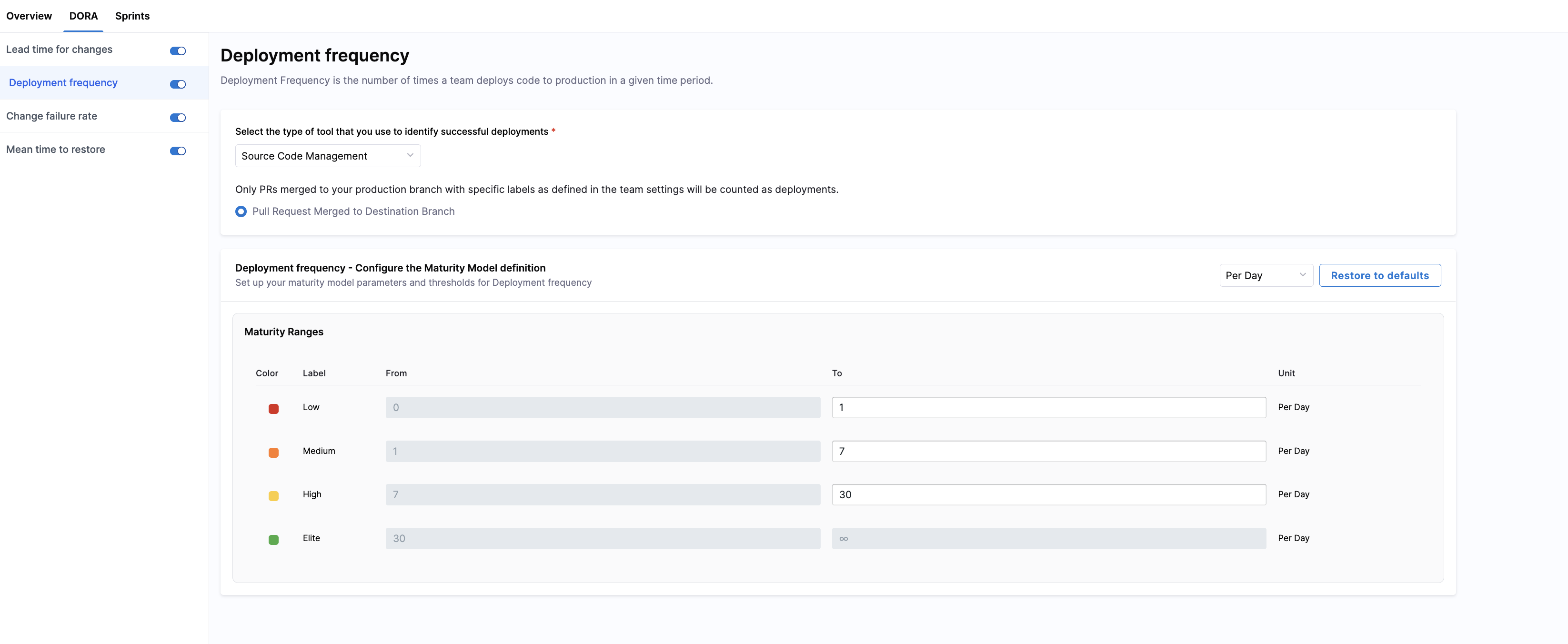 You can classify your teams' mean time to restore (MTTR) performance into four color-coded bands in the Maturity Ranges section. Customize thresholds for Elite, High, and Medium performance; the Low band is automatically inferred.