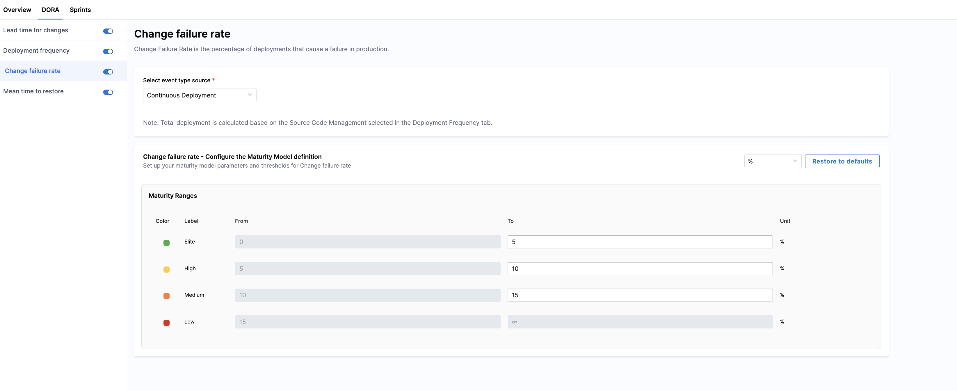You can classify your teams' change failure performance into four color-coded bands in the Maturity Ranges section. Customize thresholds for Elite, High, and Medium performance; the Low band is automatically inferred.