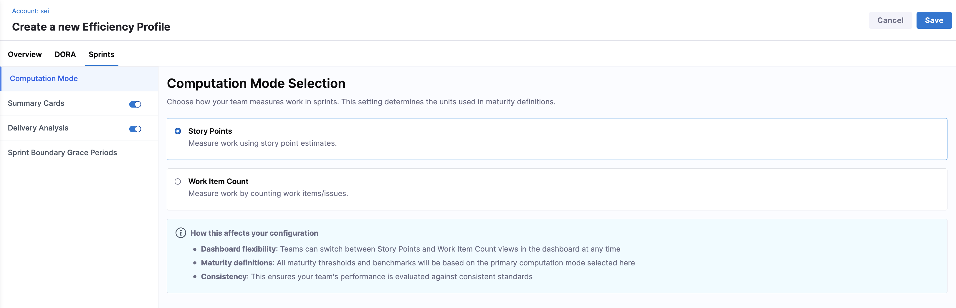 The Sprints tab lets you configure how sprint-based work is measured, analyzed, and displayed across SEI 2.0. Sprint configuration includes computation mode, summary cards, delivery analysis, and sprint boundary grace periods.
