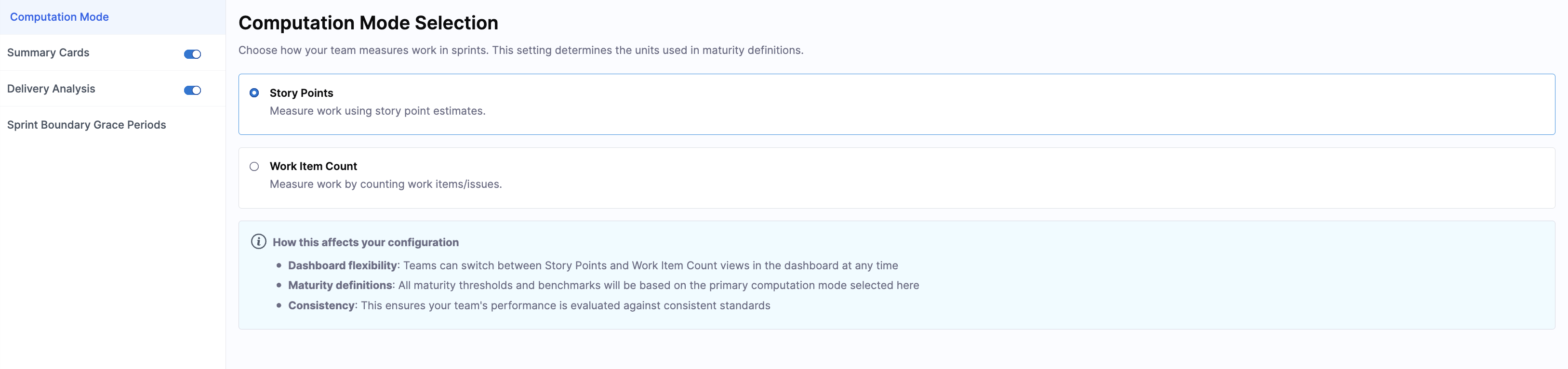 Choose how your team measures work in sprints. This setting determines the units used across sprint maturity definitions.