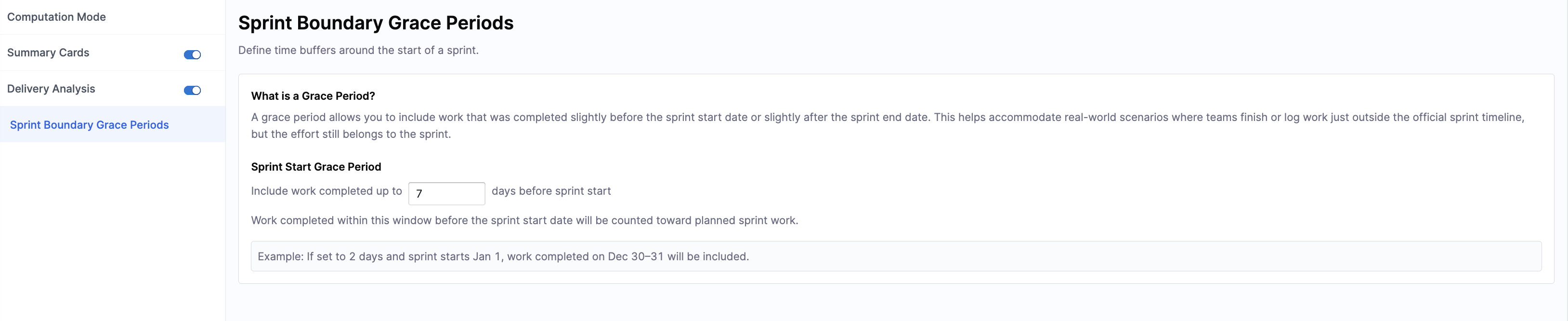 Work completed within this window is counted towards planned sprint work. For example, if you set the grace period to 2 days and the sprint starts on January 1, work completed on December 30-31 is included.
