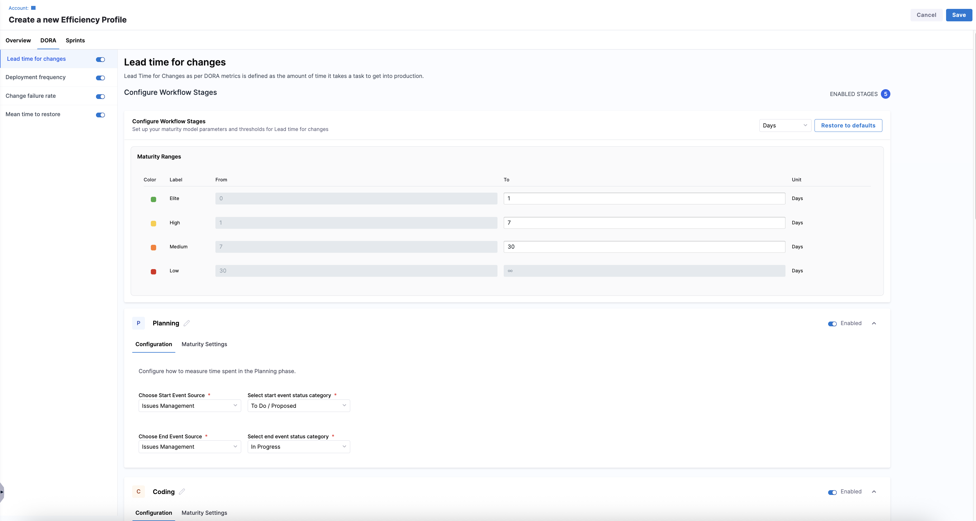 You can define the default maturity model used across all enabled workflow stages in the Configure Workflow Stages section from the Lead time for changes view on the DORA tab. Choose how lead time is measured (in Days, Hours, or Minutes) and click Restore to defaults to reset thresholds to system defaults.