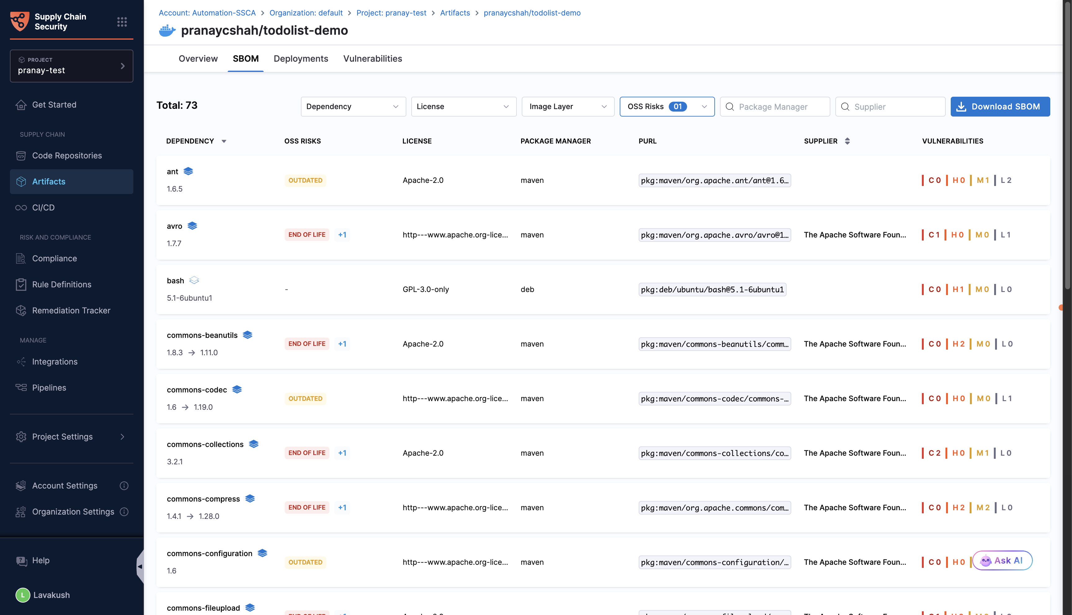 • We set the refresh interval for OSS component data to every 2 days. After you run the SBOM Orchestration step, the data is updated asynchronously within 5 – 10 minutes.